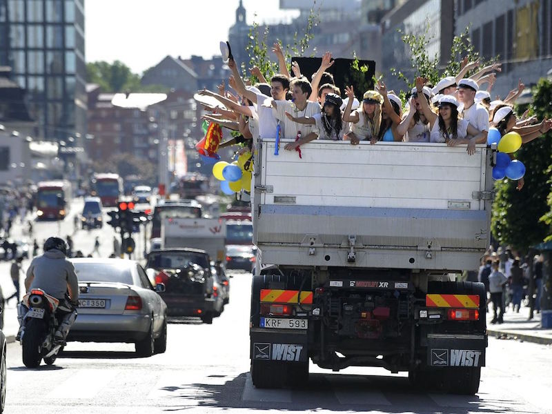歓声をあげる卒業生を乗せ、クラクションを鳴り響かせながら、こんなトラック(スウェーデン語でStudentflak)が街のあちこちで見られる。