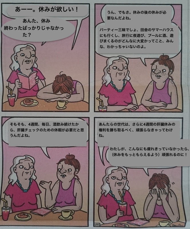 娘:「うん、でもさ。休みの後の休みが必要なんだよね。パーティー三昧でしょ、田舎のサマーハウスにも行くし、旅行に夜遊び、プールに酒、遊びまくるのがどんなに大変かってこと、みんな、わかっちゃいないのよ。」