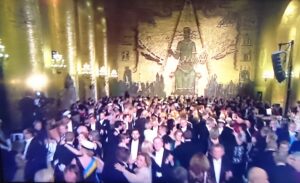 以下は、ノーベル晩餐会後のダンスパーティーの模様。日本人受賞者はこの時間が苦手で、自由参加なので参加しない人が多いが、西洋人たちは所狭しとぎゅうぎゅう詰めになって楽しんでいる。このダンスパーティーが始まって少したった11時半過ぎ、数時間にわたるテレビのノーベル晩餐会の生中継番組が終わる。