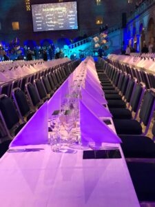 上の写真はエリクソン晩餐会、下の写真が昨年(2018年)のノーベル晩餐会が始まる前。机も椅子も同じ。