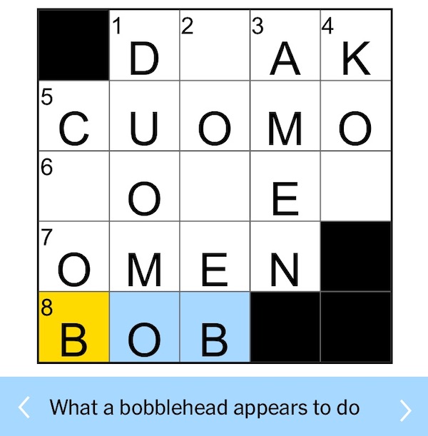 たとえば新聞のクロスワードパズルにもこんな風に「バブルヘッド」が出てくる。(8の横の問題:「bobbleheadがよくやることって?」こたえはbob、ぴょこんとおじぎすること。)