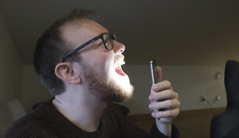 (上の写真):風邪で38度の熱と喉の痛みのあるレポーターがお試し受診。医師に喉を見せるように言われて、スマホのカメラに向かって口を開けているところ。