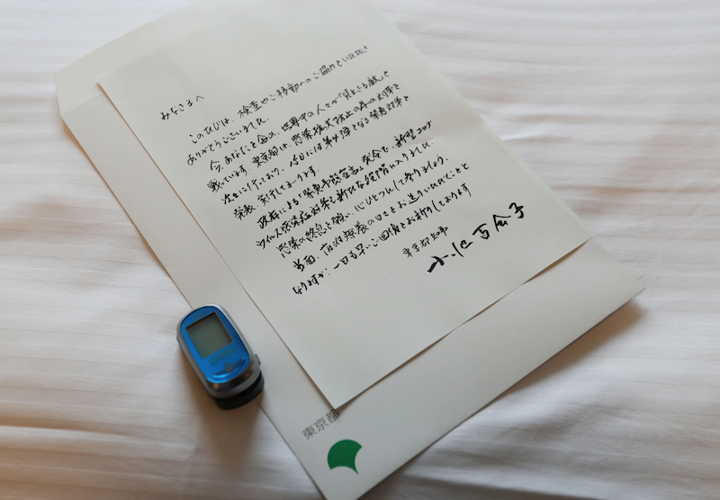 コロナ隔離で宿泊する客に宛てた小池都知事の「ご協力ありがとうございました」の手紙で、東京のホテルのベッドの上に置かれているそうだ。