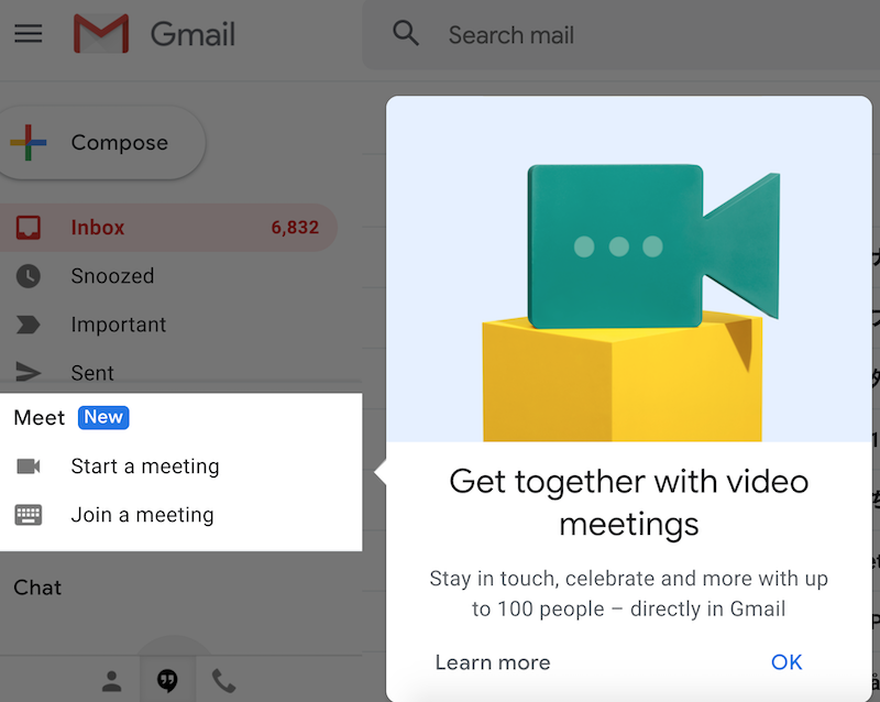何かと思ってよく見ると、ビデオミーティング機能が、メールのメニューに追加されていた。100人まで参加できるビデオ通話がこの画面から直接使えるようになりました!というそのPRが画面全体を覆い、これに目を通すまではメールも確認できない状態になっている。