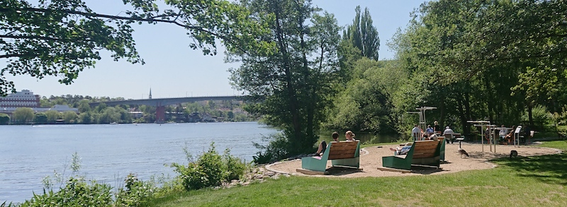 こちらは人と人が密接しているわけではないが、例年どおりにバケーションムード満載の入江。船、ヨット、モーターボート、水上スキー、カヌーなどなどがところ狭しと行き交い、大人が水遊びを楽しんでいた。