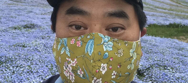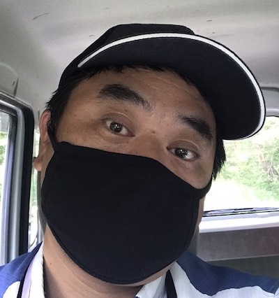 【追記】ドアップで登場いただいたこのブログページを見せた木村氏が、こんどはこんな自撮り写真を送ってくれた。木村氏の布製マスクコレクションは、黒2枚に柄物1枚、あとは使い捨てだそうだ。