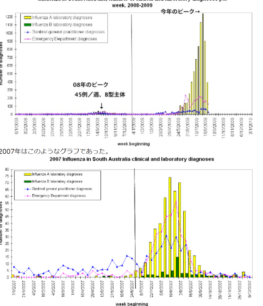 それで苦労してオーストラリアのインフルエンザの流行のグラフを探したら2007年と2009年のがあって、どちらも6月7月8月あたりに流行のピークがきている。ところが2008年のデーターもあって、この年はほとんどインフルエンザの流行が発生していない。