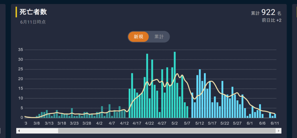 6月11日時点の厚生労働省のデーターによる死者数グラフを見てみましょう。