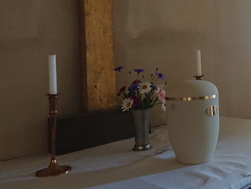 約束の時間に教会に行くと、係の人が、骨壺まで案内だけしてくれて去って行った。下の写真、白いのが骨壺。金のプレートに故人の名前が刻印されている。