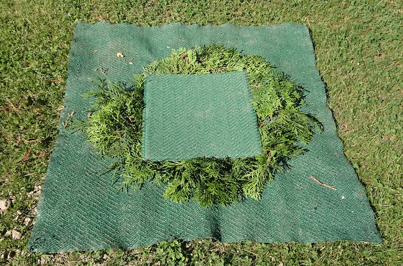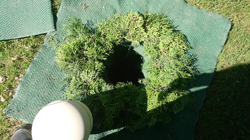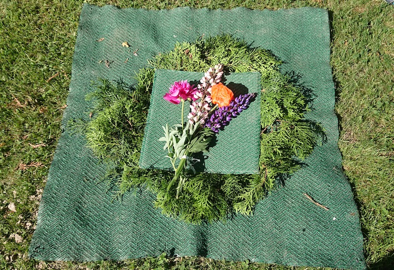 蓋を開けると、穴の底にも同じ木(スウェーデン語でThujaというヒノキ科の針葉樹)の小枝が敷き詰められていた。紐のついた骨壺をぶらさげて穴の中に納める。同居人は「お母さん、小さくて軽くなったな。」とつぶやいていた。