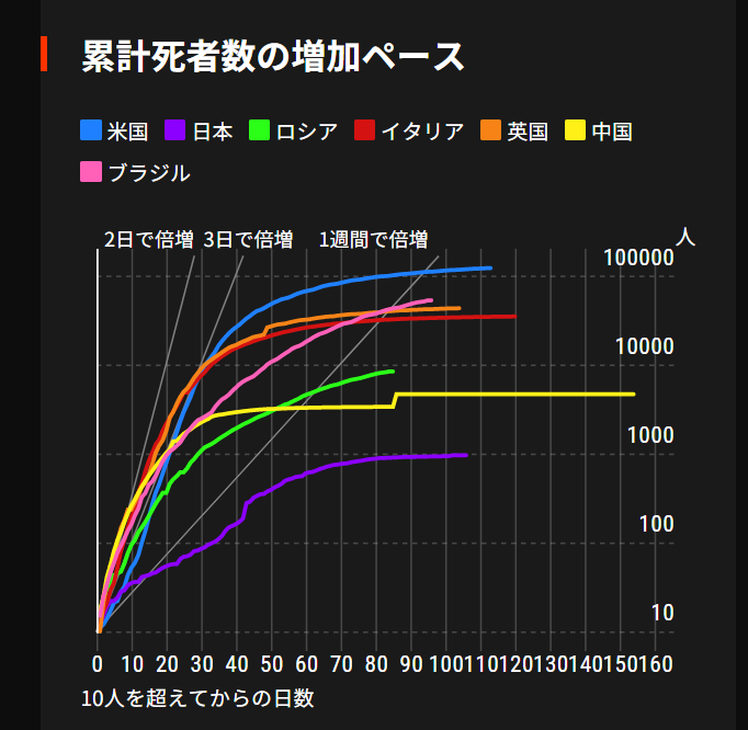 米国は横ばいは横ばいだけれど、対数グラフにも関わらず上昇傾向がはっきりみえるから、まだまだ終息とは言えない。