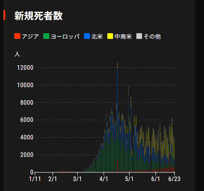 それでついでにいろいろ調べたら、死者数について立派な表が作られているのを発見した。世界の地域別死者数グラフを見ていただきたい。