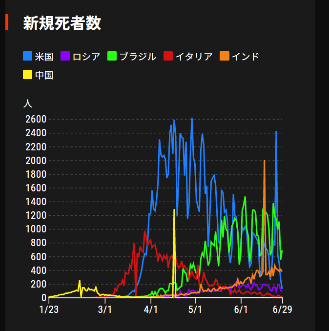 米国、ロシア、ブラジル、イタリア、インド、中国が出てる。信用ならない中国を除くとして、それぞれ1日あたり1000人を越える死者を経験していて、まったく日本と比べてうかがい知れない世界なのではありますが、それでもイタリアは終息したと言って良いし、一日2600人も死んだ人がいる米国すら終息傾向にあるように思えるし、逆にロシア、インドはまだ増加中と見えます。