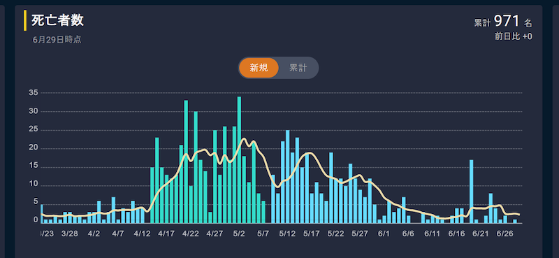 グラフは6月29日現在の日本でのコロナ死亡者数グラフです。