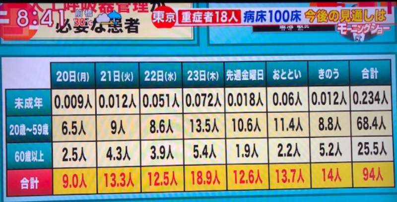 いずれにしろモーニングショーは一週間後に重症者は94人増えると計算し、こりゃ大変だと騒いでいた。