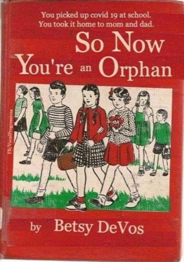 だから、学校に行けなくても仕方ないという三段論法かと思ったらそうではなくて、トランプやベッツィ・デヴォスの属する共和党は、学校閉鎖には反対なのだそうだ。トランプが学校を再開するよう圧力をかけているにも関わらず、学校閉鎖が続いており、ベッツィ・デヴォスが教育長官という立場であるところが、この風刺画の「面白さ」ということらしい。