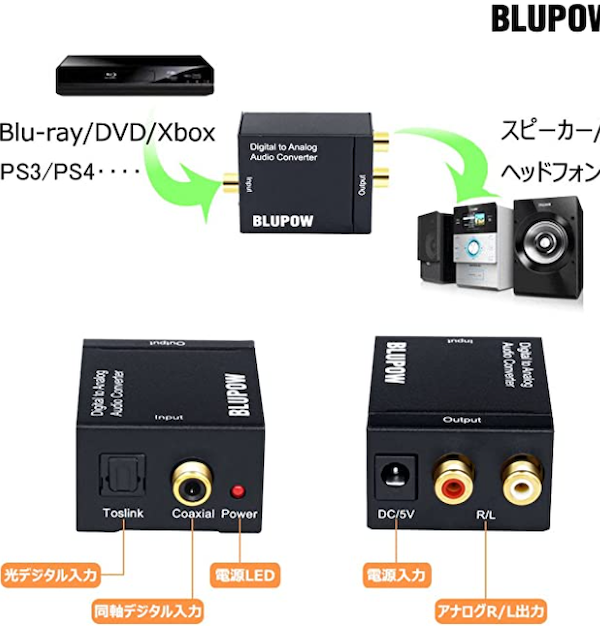 DAコンバーターは写真のような箱で、光デジタル入力と同軸入力があって、アナログ出力がある。