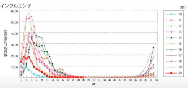 2010年に新型コロナが発生し流行を発生させた跡がインフルエンザ流行曲線への影響(ウイルス干渉)として現れている。グラフ中20年となっている赤い太線がcovid19が流行した今年のインフルエンザの流行状況を現している。