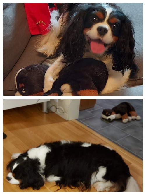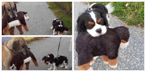 散歩中に出会ったわんこ同士が同じようなぬいぐるみをくわえ、見つめ合っているシーン、面白すぎ!「え!? キミも!? 気が合うな!」と会話しているようにしか見えない。(笑)
