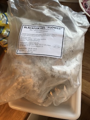一匹の冷凍ダコ、3キロの重さで600クローナ(最近のスウェーデンクローナの対日本円価値は低いがそれでも約7,300円。)也。