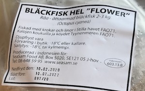 「太平洋で一本釣りされたタコ」とはなんとも魅惑的な響き。スウェーデン語がわかる人はラベル表記をご覧あれ。