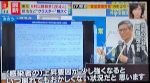 次に専門家と称する医師が出てきて「現在、重要な局面にある。今の段階で踏みとどまる必要がある。3密を避ける、手洗いうがいをするなどをもう一度認識すべきだ」などと、言った。