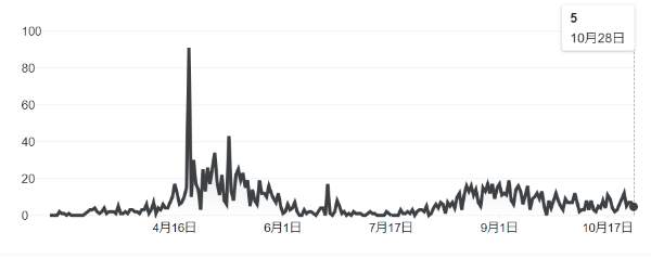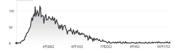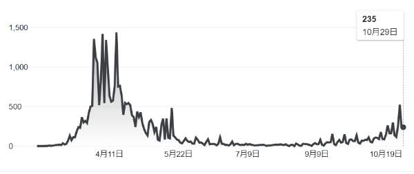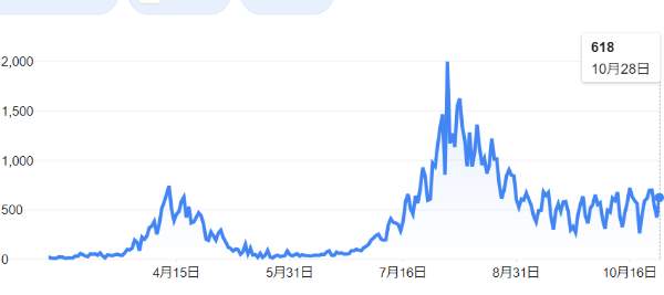 おっと7月ごろからじわじわ陽性者の数が増えてきて、今月に入ってものすごいあがり様で、なんと1日36000人の感染者! これはケゾえもん係数グラフにすればもう少しあがり方はゆるやかになるとは思うのですが、ちょっとデーターがないので係数グラフは作れない。