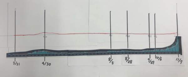 わたしがケゾえもん係数グラフを書くとき4月30日の縦軸は4.995mmのところに8月5日の縦軸は0.74mmのところに・・・以下同様で11月7日は3.9mmのところとなる。