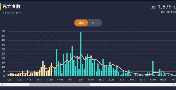 そこで皆の注意は死者数グラフに集中する。この病気でどのくらいの人数が死ぬのか?そして死者は少ない日多い日とあるので、その時ははっきりわからないが5月の終わりまで待つと5月8日をピークに1日最大50名(これは1日だけ)死んだ事象が発生したが、さいわい終息を迎えたことがわかる。