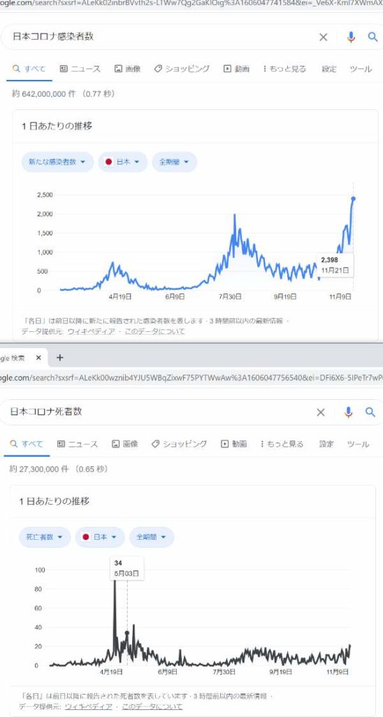何べんも見せて恐縮だがグラフはいつもの日本の感染者数と死者数のグラフと