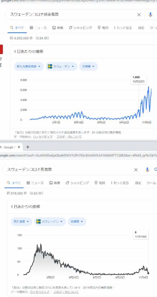 スウェーデンでは10月21日まで死者数0人から5人だったし(その後小さいピークが出たけど、なぜって流行したからだろ。だけど集団免疫だからこれだけ小さいピークで終わった)、日本だって8月に入ってあがったように見えるけど15名になった日は一日もなしで、これは人口比を加味したグラフにすれば、スウェーデンとそん色ないというよりスウェーデンより低空飛行だと言える。