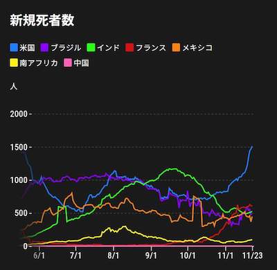 医療崩壊しないのか?ということだ。本日の各国の死者数グラフを見て欲しい。