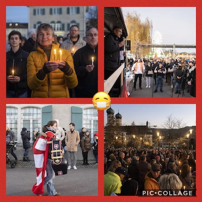 2020年11月21日土曜日午後、スイスのシュヴィーツ州ラッヘンで、コロナ対策が強化されたことに反対するデモが行われ、約1,000人が着用を義務づけられているマスクをしないで集会に参加した。[出典:ルツェルン新聞(ドイツ語)]