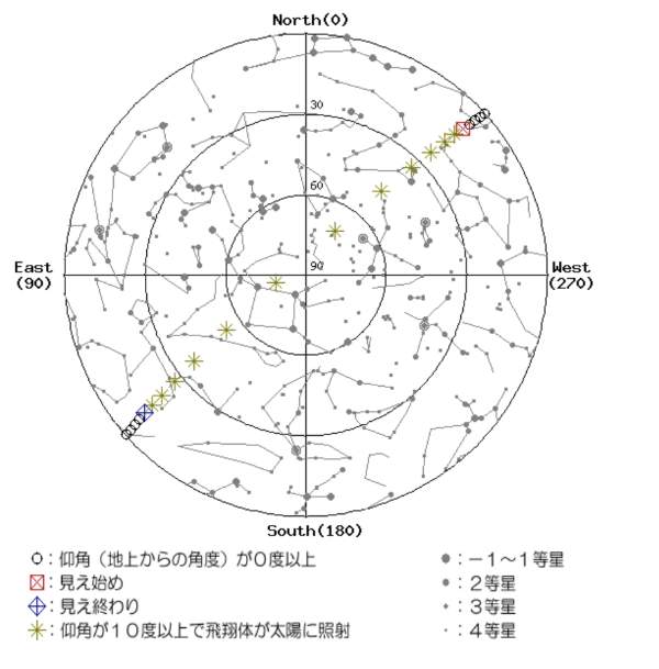 北西の地平線近くから17時9分ころ(もうちょい遅い方が良いが、日の入りが16時半ごろだからまあまあだと思う)あがってきて、天頂付近を通過して地平線近くまで行って突然消失する。