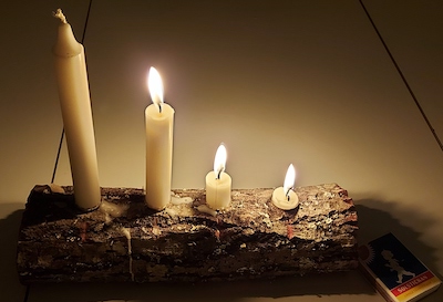 3rd アドベントが過ぎろうそくは3本。燭台は、子供が学校の工作で作ってきた生木。横のマッチ箱には語れば長いスウェーデンのヒストリーがある。