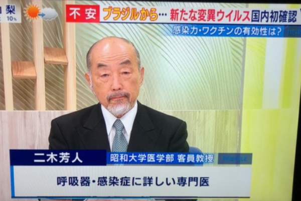 1月11日のフジテレビとくダネ!にコロナ評論家の一人、二木芳人昭和大学医学部客員教授が出演し、変異ウイルスについてコメントしていた。