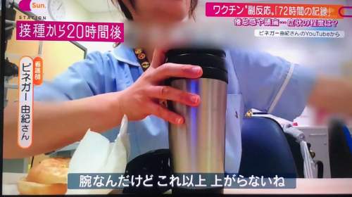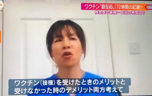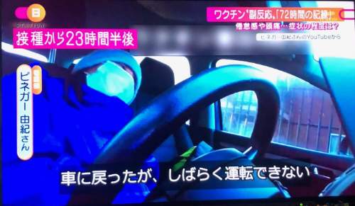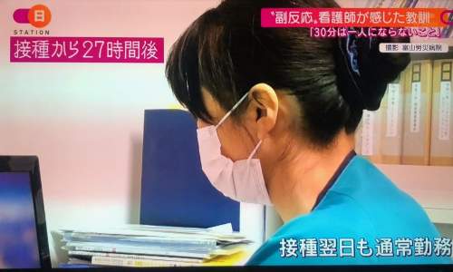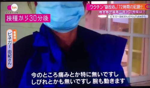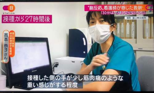 先ずは、こんな副反応がいつも発生するわけでないという証拠に日本の病院の看護師高本さんの例をお見せすると「手が重い感じがする」程度だと言う。