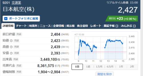 それがね、一度下がり傾向でしょ。いったん手じまいしたのです。2415円で買ってあったやつを2420円と2431円ですべて売り払った。なんで価格が二つかって? 2420円は個人の分で場が始まる前に仕掛けといたらあっさり売れた。後は会社の分だけど忙しくなって忘れていて(私はそんなに真面目に株はやってない)思い出してあわててみたら2431円だったので、忘れていたのがこれはよかったのだ。それで本日の安値は2393円、高値は2439円。本日の終値は2427円。お前のコロナ予想が外れたって?違う違う株価は理屈通りに動かないって言ったでしょ。JALの株価が下がるのは私のせいじゃない。
