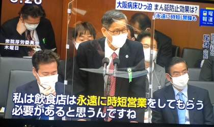 「コロナはまだまだ流行の真っ最中だ。コロナがまん延するのをふせぐために国民は行動変容して犠牲を受ける必要がある。ところが最近慣れてきて国民の協力を得るのが難しくなってきた。なんとかさせないといけない。飲食店も要請だけではもう不十分だ。見回りしてきびしく指導して言うことをきかせる必要がある。それが嫌だと言うなら永遠に時短だ。」