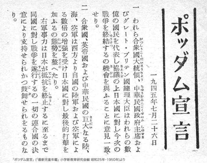 そして1945年7月には日本は戦争遂行能力をほぼなくしていた。そこに米国、英国、中国の連名で日本に降伏勧告(ポツダム宣言)がされる。しかし特に陸軍は敗戦を承知しない。その時陸軍から日本国民に出た命令は日本本土に米軍が来たら竹槍を持って戦え、米国軍人は腹が弱点だからそこを狙って刺せというもので、つまりは全員死ねということだった。