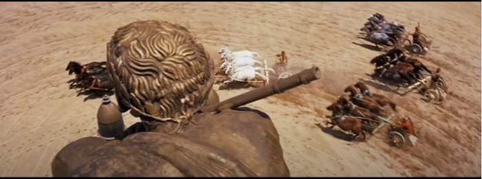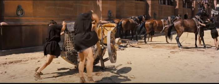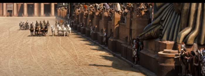 馬車競争は4頭立ての10台程度の馬車により行われて、一周は約400メーター(私の推定)のオーバルコースによって行われて、こういうレースがローマ時代に実際に行われたのかどうか知らないがむしろヒントはインディ500なのではないかと思われる。馬車競争の最中に破壊された馬車を次の周回で馬車群がやって来る前に機動的に片づけるのであるが、ローマの馬車競争を誰も見たものはいないわけで、これは自動車レースのマーシャルたちの活躍がヒントになっているのではないかと考えられる。それではらはらさせるためにマーシャルたちが力づくで馬車を片づけるのを少しもたもたさせたりするのだけれど、これはむしろクレーンとか台車とかを駆使させてもっと見事に片づける様子を見せた方がおもしろかったのにと私は思う。