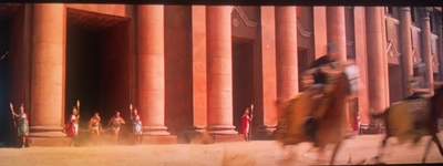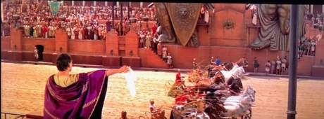 はっと気が付いたんだけど、ウィリアム・ワイラー監督が戦車競技場を中央に巨大オブジェのある変な競技場にしたのには理由があったんだ。だってさ、CGのない時代に数万の人間のいる観客席を見せることは超難しい。しかし中央に巨大オブジェがあれば、観客席側からの映像を見せれば映るのはオブジェの壁で観客席は見せないで済む。いくらハリウッド黄金時代でも数万人のエキストラは雇えないからねえ。
