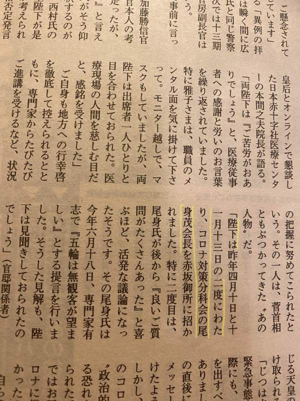 ガールフレンドが送ってくれた文春の記事を見ると陛下に2度も招かれている。オリンピックが始まる前に陛下が宮内庁を通してオリンピック開催に対する懸念を表明されたのは、尾身がなにか余計なことを言ったせいなのだ。ただの一介の年寄りの医学者が天皇にご意見し、毎日、新聞記者やテレビカメラに囲まれる地位にまで登り詰めたんだよ。その地位を軽々に手放したくないと考えるのは自然だ。