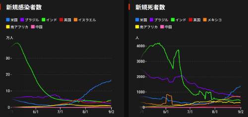 下のグラフを見て欲しい。緑がインドだ。世界の中でひどかったインドも感染者数、死者数とも激下がりだ。