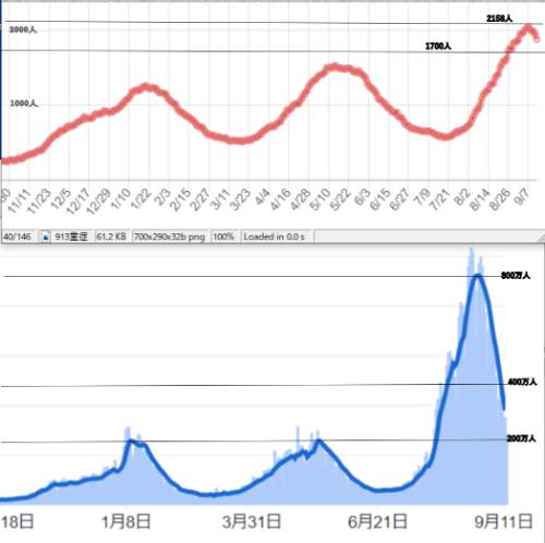 上の赤いグラフは重症者の数である。感染者が増えれば重症者も確率の問題で増える。感染者が減れば重症者も減るが感染者の減りよりも、これは遅れて減り始める。8月26日から感染者が減り始めたので重症者の減るのを楽しみに待っていたのであるが、遂に9月7日より減り始めた。こうなりゃしめたもんだ。