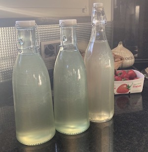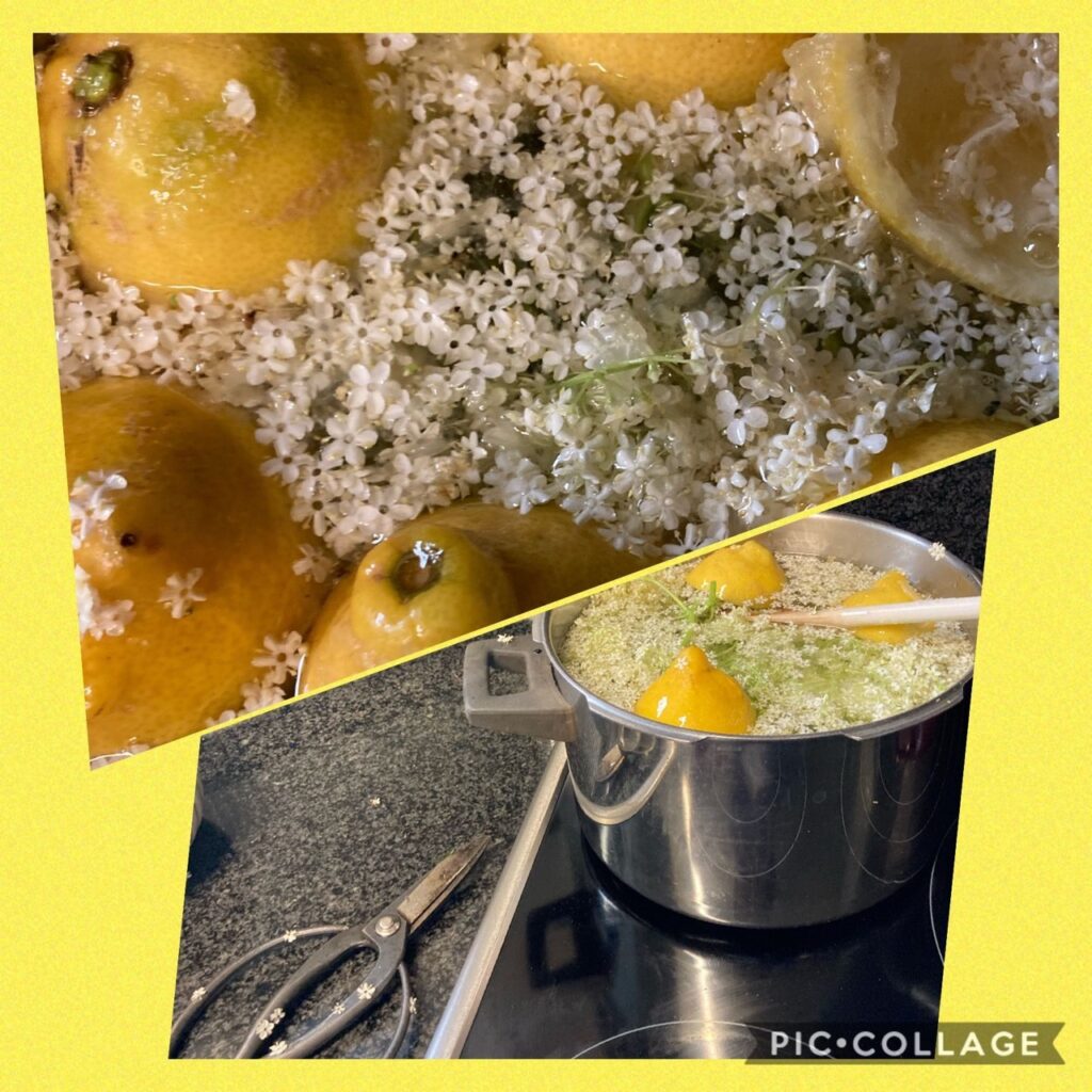 1. 沸騰させた水に砂糖を入れて溶かし、冷ましたところに、レモンの果汁と、絞りカスのレモン、ニワトコの花、クエン酸を加えて、暖かくない場所に4日間置く。