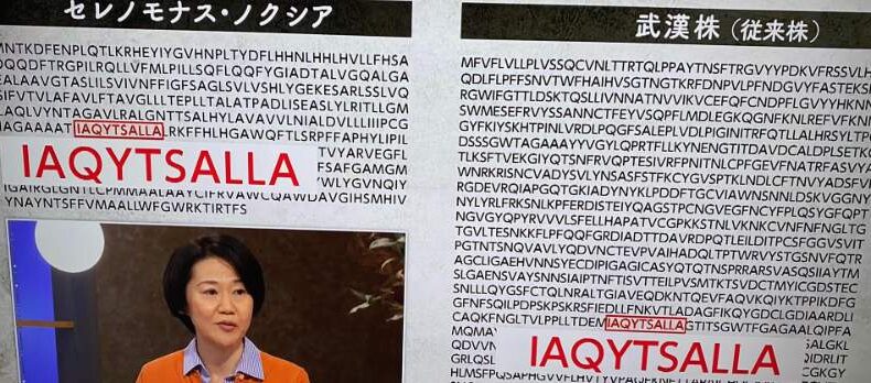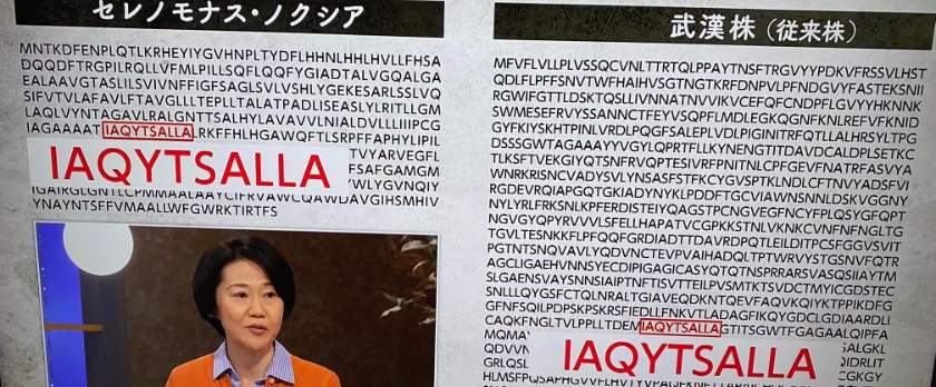 写真左のセレノモナス・ノクシアというのは日本人がみんな口の中に持っている常在菌で口の環境を悪くした場合、この菌が歯周病を発生させる。写真が示すのはそのアミノ酸配列。また右はコロナの武漢株のアミノ酸配列である。両方共に「IAQYTSALLA」という配列がある。日本人のT細胞はこの配列があるやつは注意ということを日頃から知っていて、武漢株が来たとき「こいつ要注意だ」とすぐさま認識できたということらしいのだ。つまりセレノモナス・ノクシアがワクチンの様な働きをしたらしい。ちなみにこのIAQYTSALLAという配列があると言うこと以外セレノモナス・ノクシアとコロナには共通点はほとんどない。免疫の不思議というしかない。