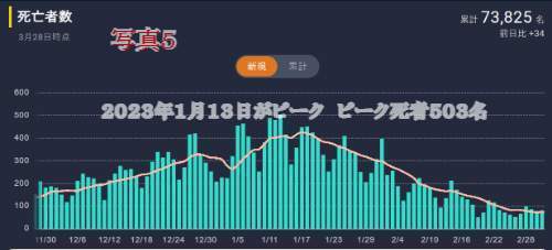 前回記事で紹介した、死者数を現すグラフの右上に73825という数字がある。これはこのグラフを参照した2023年3月28日現在のコロナ禍発生以来3年間の日本の死者累計である。約7万4千人が3年間でコロナで死んだことを表している。
