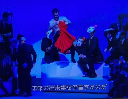 この演出家、それだけでは済まさなくて2幕2場でさらに追い打ちをかける。フローラの夜会という場面で冒頭、闘牛士のダンスの場面があるのだけど、ダンサーとしてジェルモンが登場して(台本にはない余計な事)しかも上半身はだか刺青だらけの悪おやじという役柄でヴィオレッタを徹底してからかうダンスを披露するのだ。あざ笑いながらヴィオレッタの赤いドレスと同じものを闘牛士の赤い布の代わりに振り回したりする。しまいに自分で着て高笑いする。