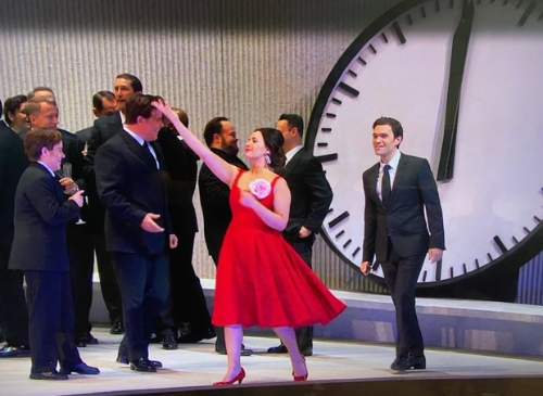一方、わたしが文句たらたら言っている椿姫だ。このオペラに出て来る女性は前述の様にヴィオレッタひとり。夜会の場面で赤いワンピースを着ている。あえてパーティー衣装でなく、シンプルなワンピース、しかし豪華に見える生地をつかい、いろいろやらせるので着脱がスムーズでなければいけないってのがメトの衣装部へのこの演出家の注文だろう。そんなのお見通しだよ。